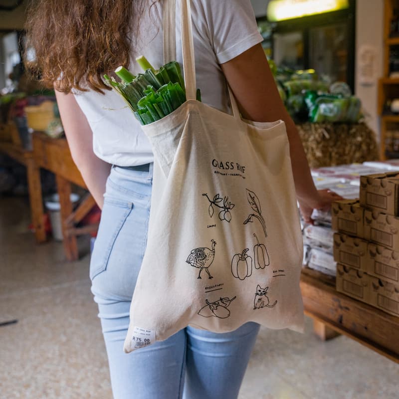 At our farm stall, we stock our very own Grass Roof tote bags, t-shirts, and cycling shorts, as well as local brands.